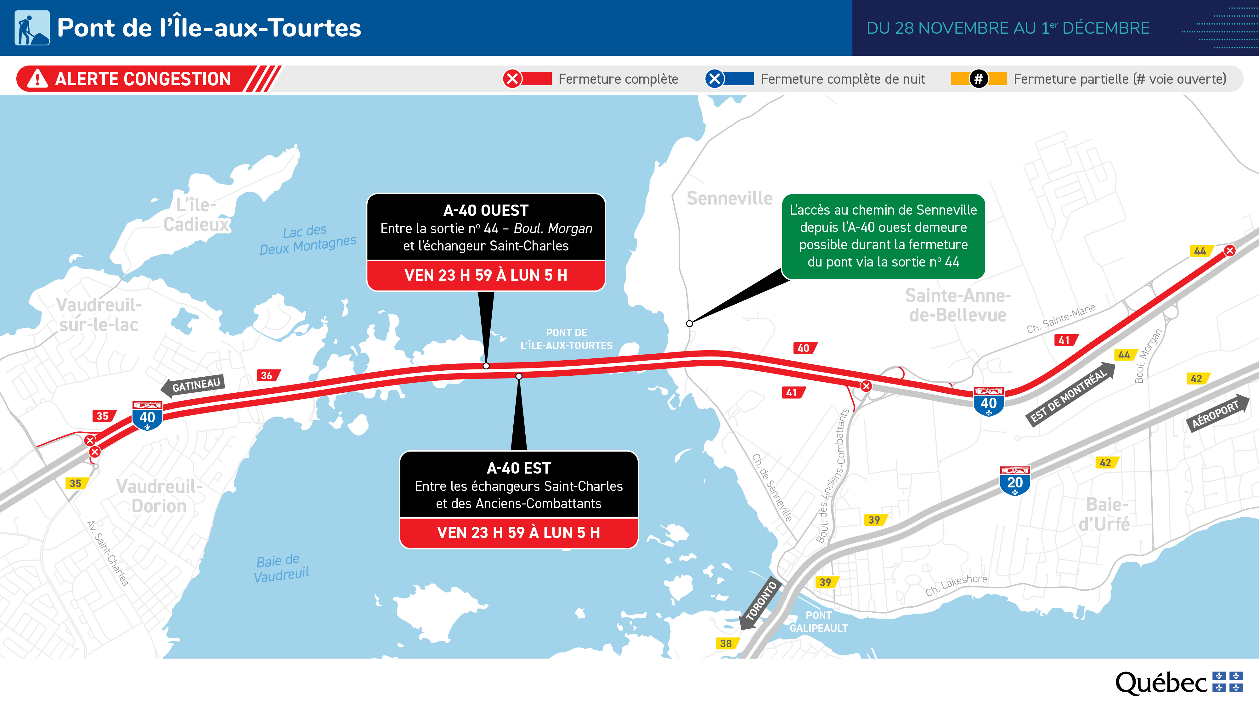 Le ministère des Transports et de la Mobilité durable vous informe que le pont de l’Île-aux-Tourtes, reliant Senneville et Vaudreuil-Dorion dans l’axe de l’autoroute 40 (Félix-Leclerc), sera complètement fermé durant la fin de semaine du 28 novembre. Cette entrave est requise pour mettre en place une nouvelle configuration des voies de l’autoroute 40, à Senneville, qui permettra la poursuite de la reconstruction des dalles.