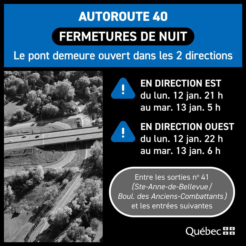 Fermeture complète de l’A-40, à Senneville, durant la nuit du 12 au 13 janvierLe ministère des Transports et de la Mobilité durable vous informe que l’autoroute 40 (Félix-Leclerc) sera fermée dans les deux directions, à Senneville, durant la nuit du 12 au 13 janvier.