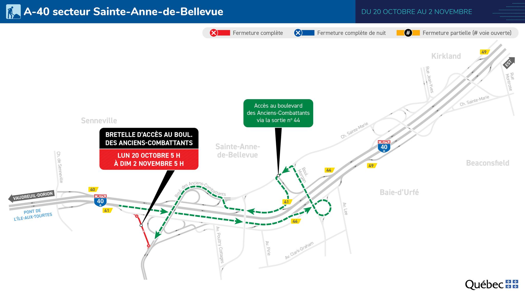 A complete closure of exit 41 (Ste-Anne-de-Bellevue, Boulevard des Anciens-Combattants) of Highway 40 eastbound will be in place on the nights of October 17 to 18 and October 19 to 20 in preparation for this work.