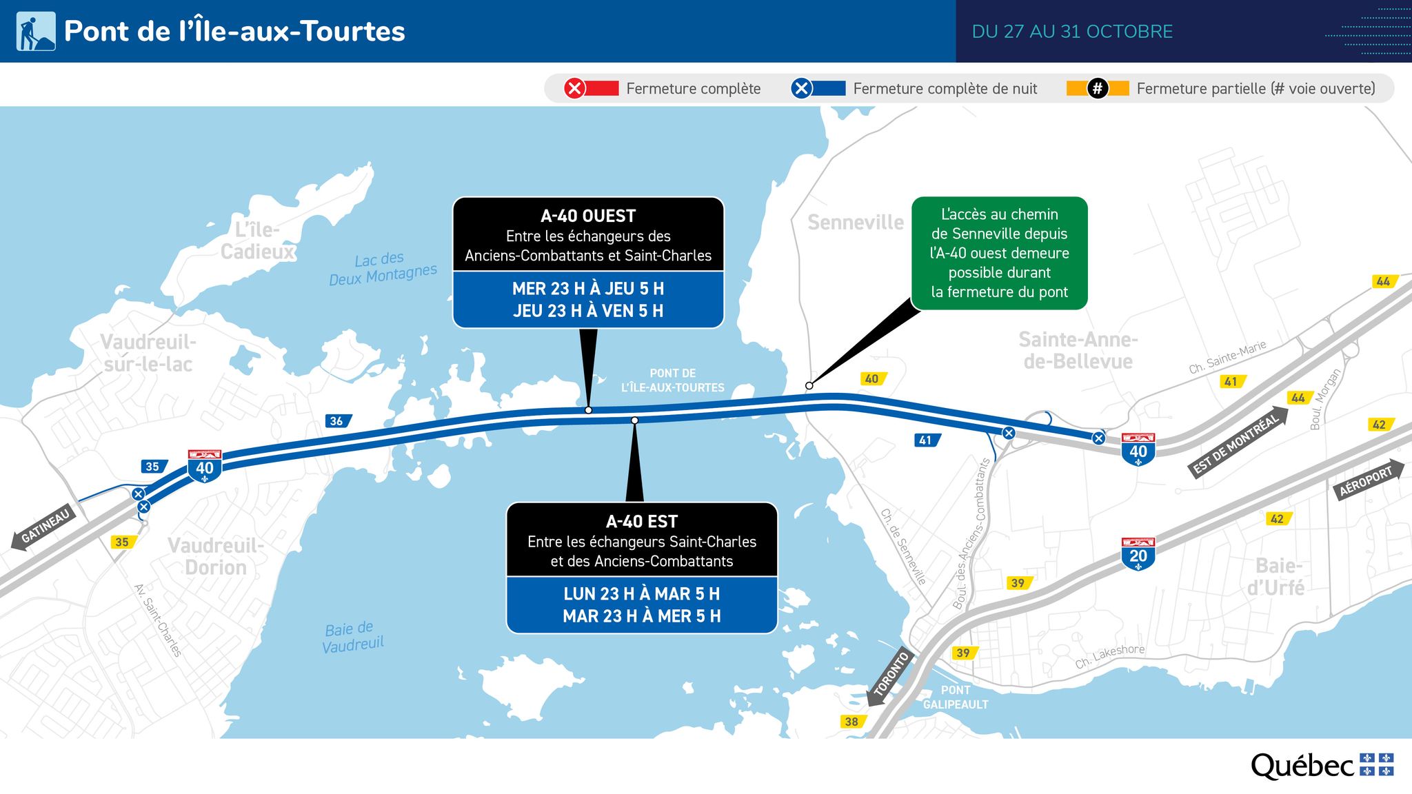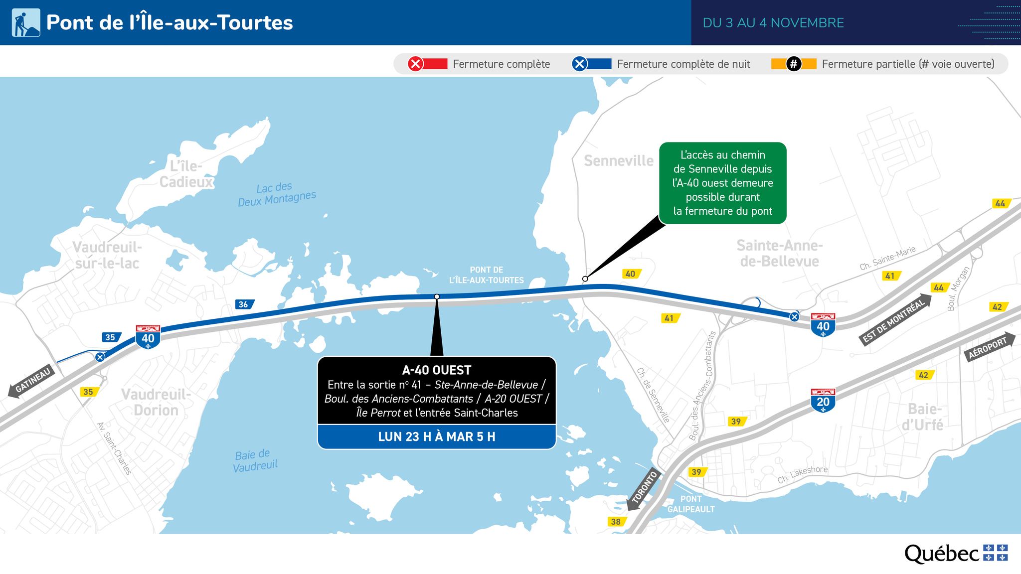 The ministère des Transports et de la Mobilité durable informs the public that nighttime closures will be in effect on the Île-aux-Tourtes Bridge, connecting Senneville and Vaudreuil-Dorion along Highway 40 (Félix-Leclerc), from October 27 to November 4. These closures are necessary to replace guardrails on the structure.