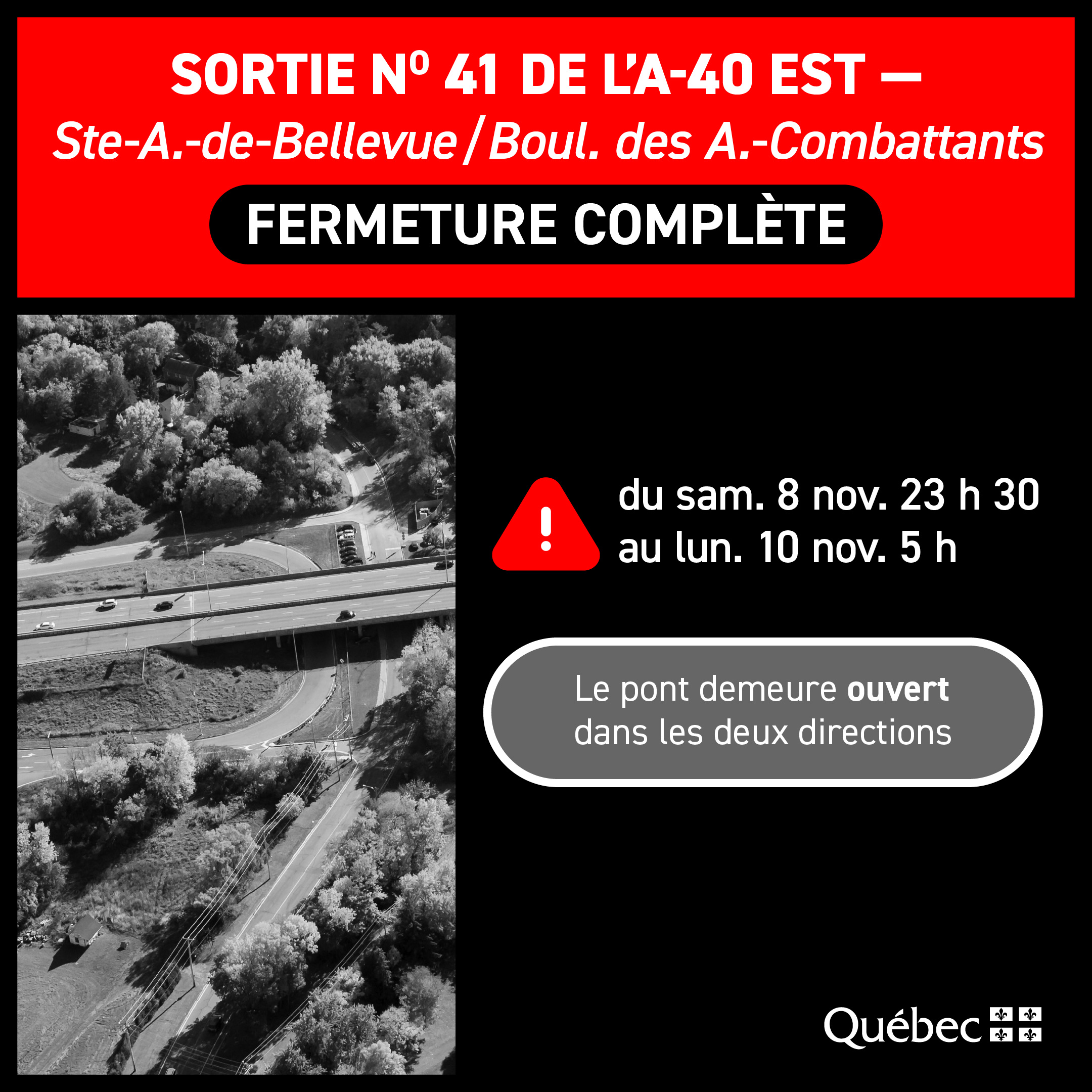 - Fermeture complète de la sortie no 41 (Ste-Anne-de-Bellevue, boulevard des Anciens-Combattants) de l’autoroute 40 en direction est.