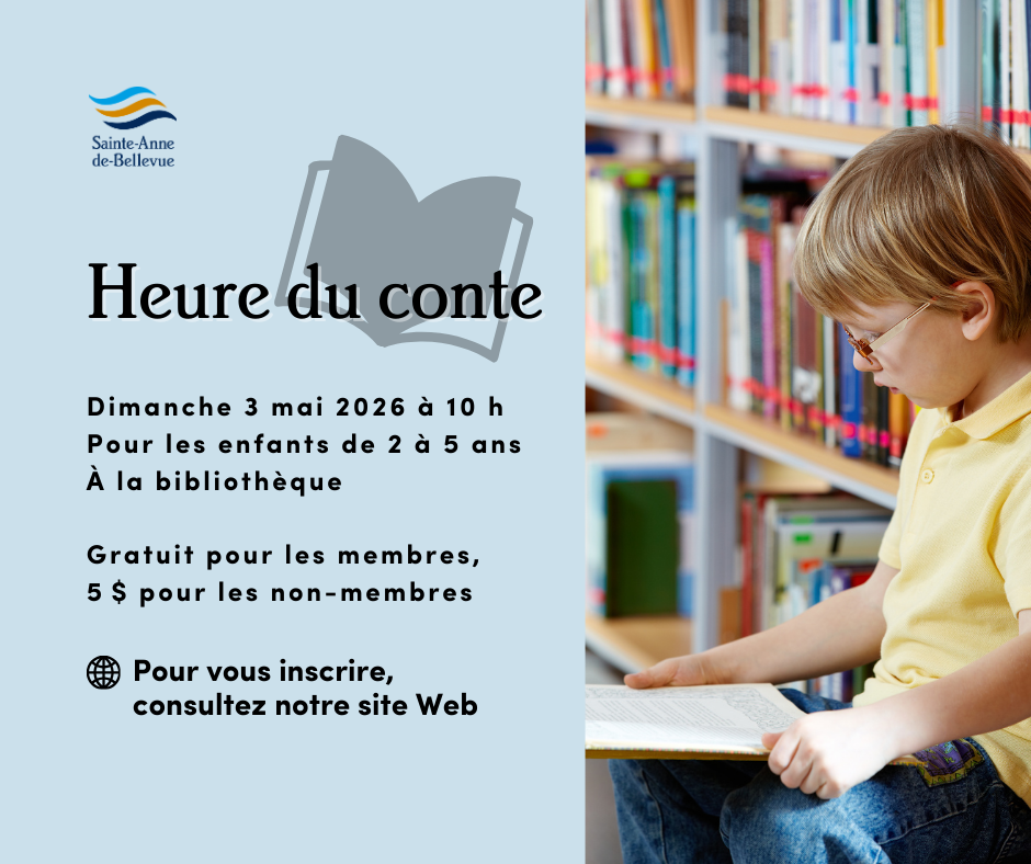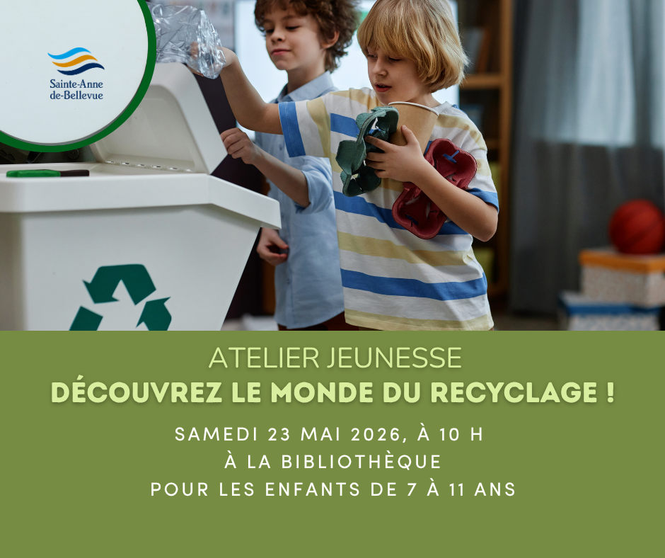Les enfants de Sainte-Anne-de-Bellevue sont invités à participer à un atelier amusant et éducatif pour découvrir comment prendre soin de la planète. À travers des explications simples, des exemples concrets et des activités interactives inspirées de la Zone jeunesse de RECYC‑QUÉBEC, les jeunes apprendront les bases des 3RV : réduire, réemployer, recycler et valoriser. Ils découvriront pourquoi il est important de trier les matières, comment donner une seconde vie aux objets et comment de petits gestes du quotidien peuvent aider à protéger l’environnement. Un atelier dynamique pour apprendre en s’amusant et devenir de vrais héros de la planète ! Inscription requise.