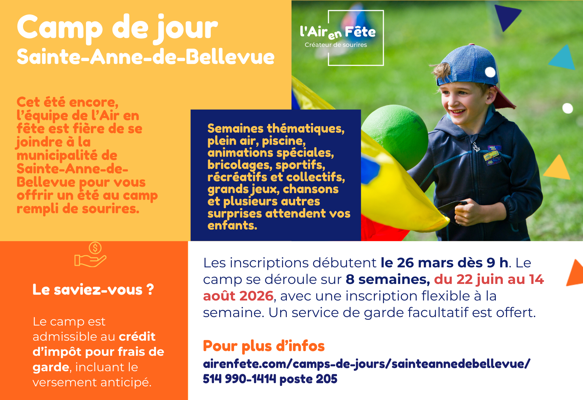 • Début du camp de jour : 22 juin 2026