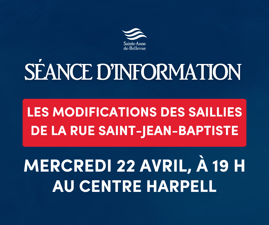 Dans le cadre des travaux de réfection des infrastructures de la rue Saint-Jean-Baptiste, la Ville de Sainte-Anne-de-Bellevue vous invite à une séance d’information portant sur les modifications envisagées aux saillies de la rue. Ces travaux sont requis après de nombreuses requêtes des résidents de la rue Saint-Jean-Baptiste.